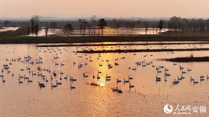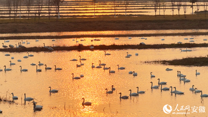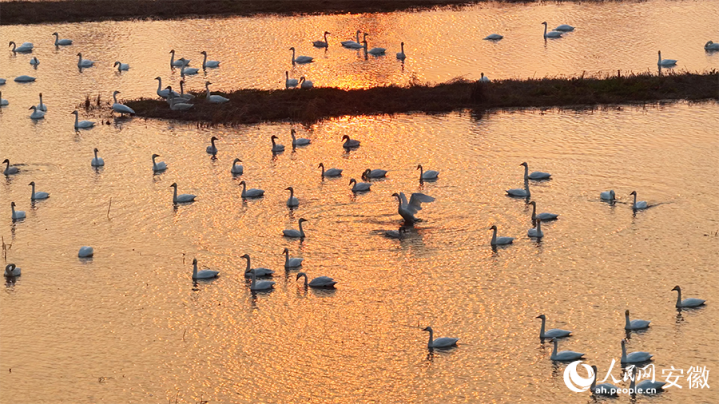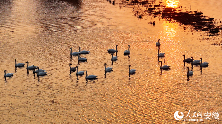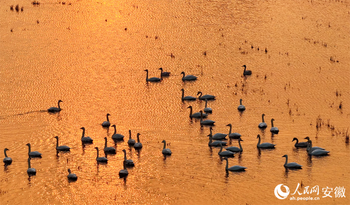 人民网合肥12月14日电(郭昊)近日,安徽省合肥市肥东县十八联圩湿地迎来大批小天鹅。日出时分,成群的小天鹅或悠然游弋,或展翅翱翔,宛若一幅生态画卷。近年来,肥东县十八联圩湿地环境持续改善,已经成为众多候鸟迁徙途中的理想停歇地和越冬地。合肥十八联圩湿地内,小天鹅正在栖息。人民网郭昊摄